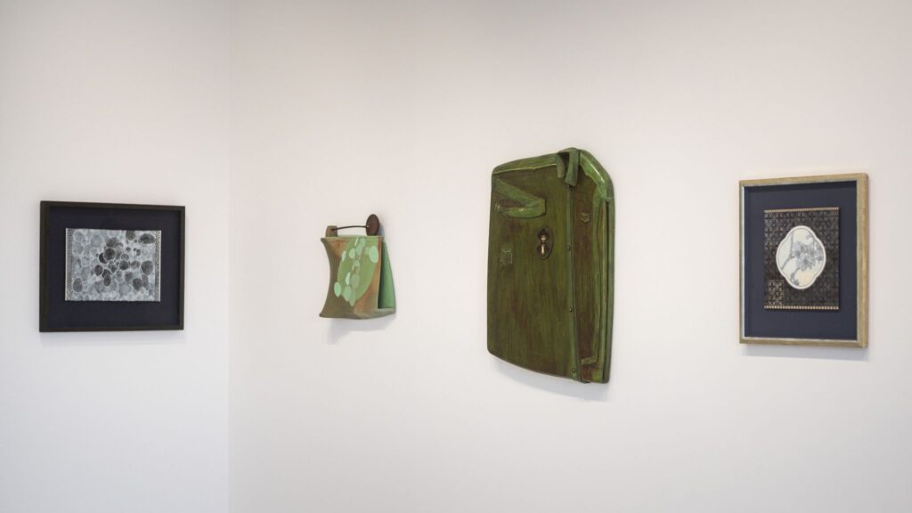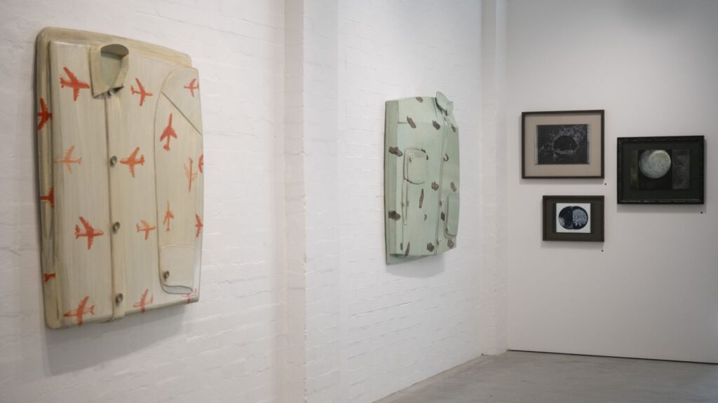 “My practice is a fractured thing, a mix of finding new directions to explore with each show, as well as refining the processes and material combinations that I pick up along the way. Ideas are found through observation, contemplation, drawing, writing, materials, form, colour, nature etc….. One of the continuing plot lines in my practice has been playing with ways of combining 2D and 3D form. This show is a two way split. Firstly, a gang of works that are playing around with the idea and form and colour of folded apparel. Clothing is an outer shell or skin that we use to hide and adorn ourselves. In its neat, folded unworn state, new clothing offers the possibility of renewal and a fresh start. There is also a series of collaborated 2D, 3D works with Nicola.” John Turier