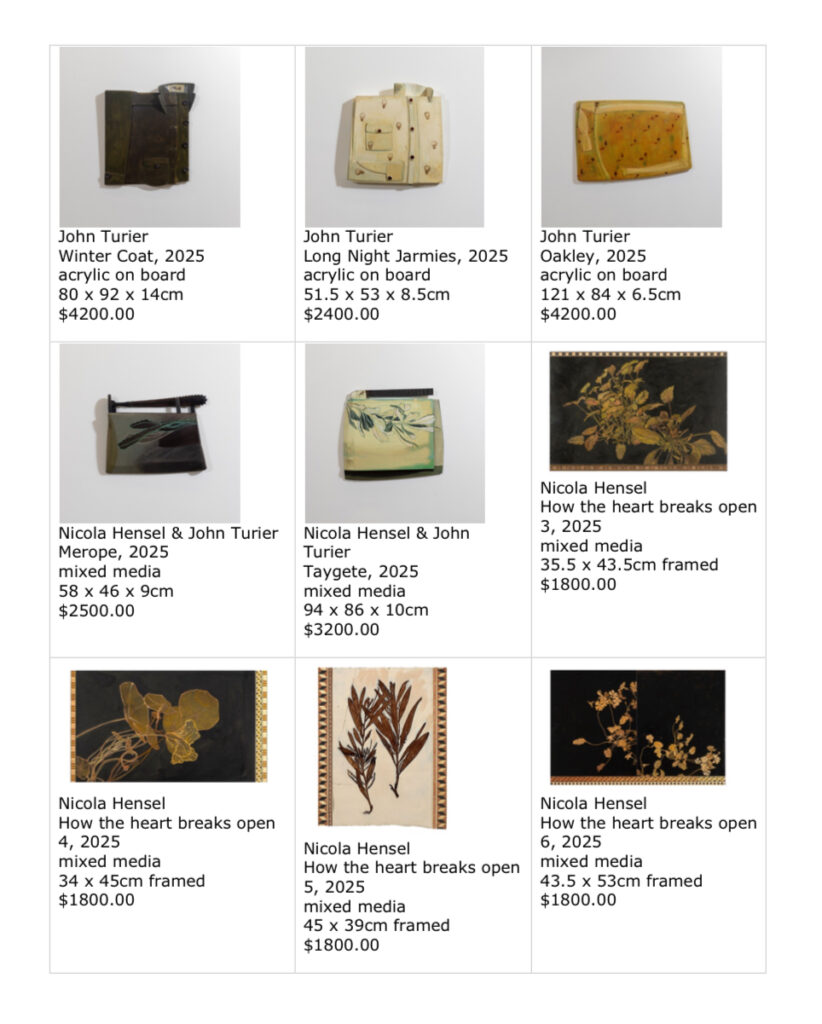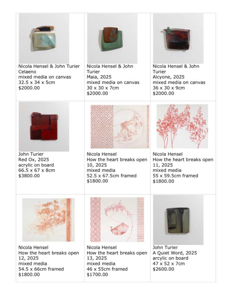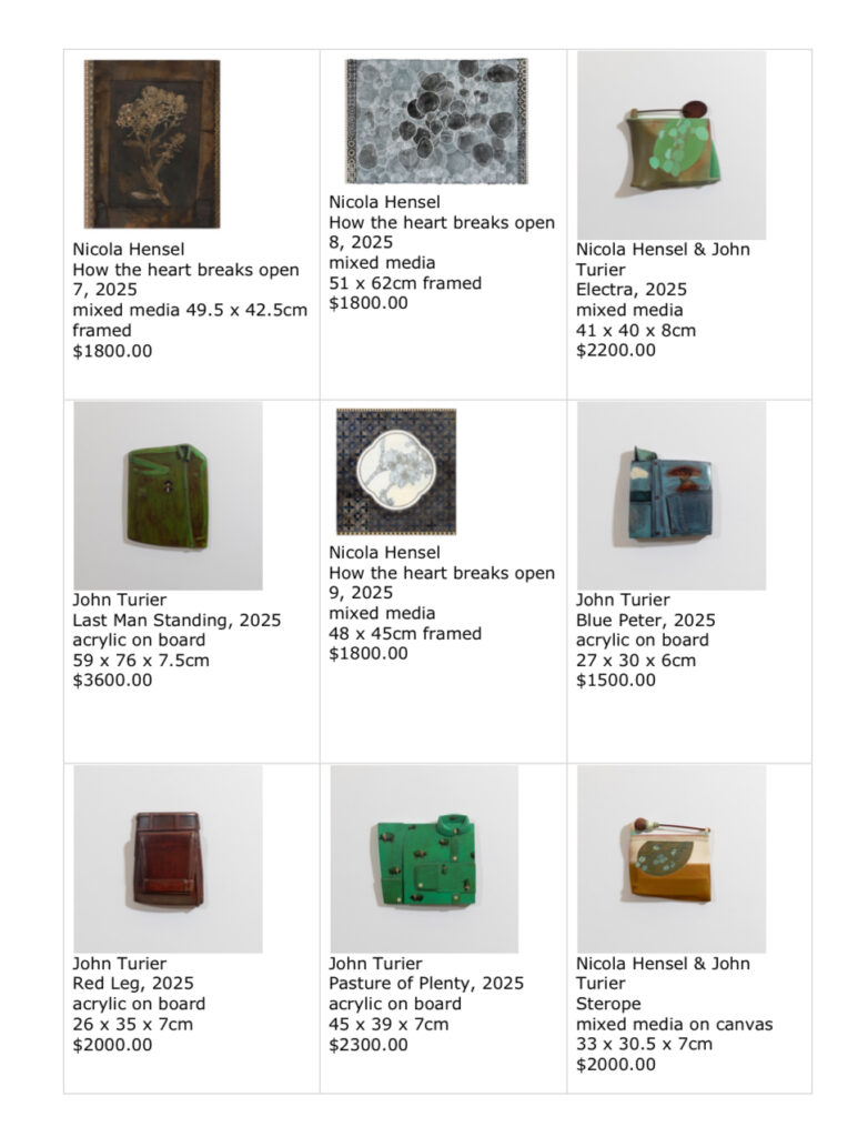 “We’ve lived beside each other for thirty three years, raising a family and making art. On the surface our styles seem different, but they are absolutely inseparable from the patterns and weave of our life together,” Nicola Hensel and John Turier