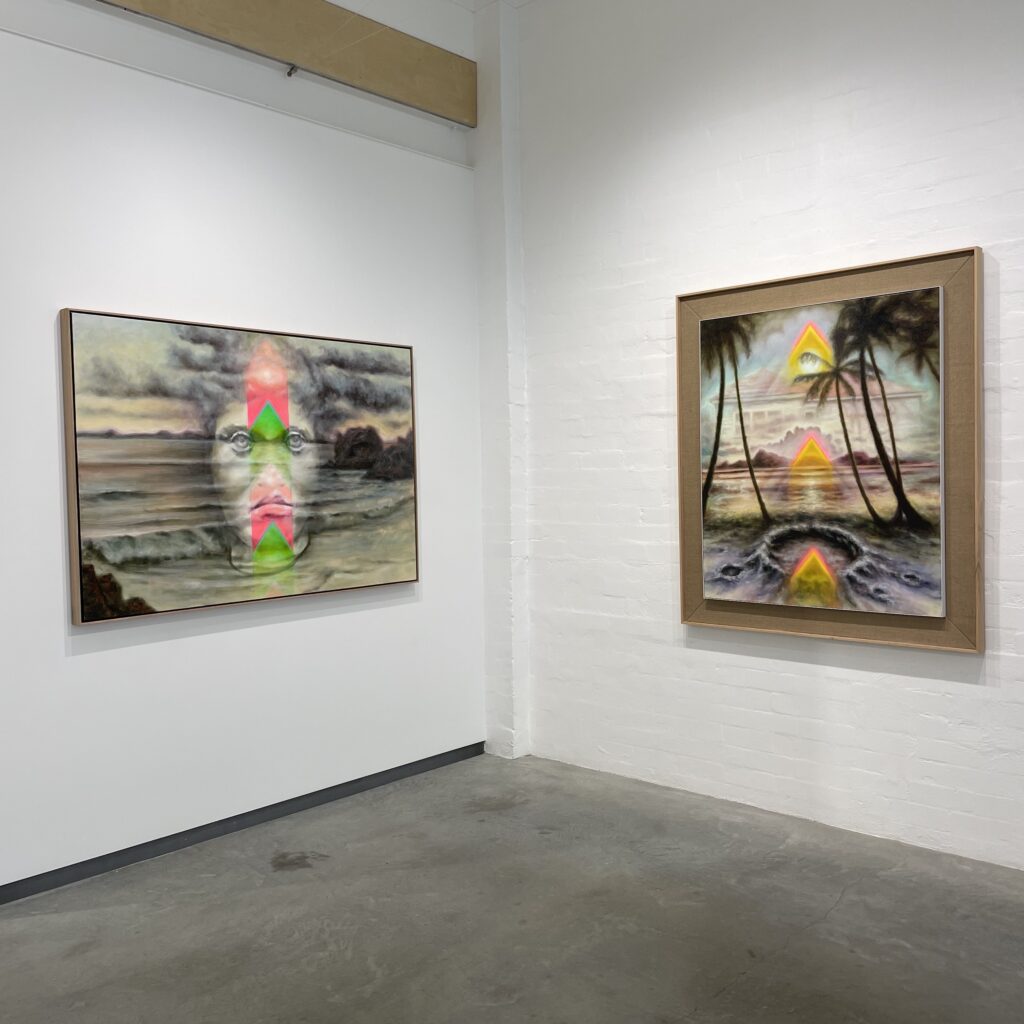 This body of work is really about myth making, this time in the form of paintings. These works pull together elements from a variety of origins. The result is a patchwork of themes and motifs, sometimes seemingly disparate, but curated to weave personally cohesive ideas. The meanings are fluid, in that; there are multiple strands with multiple points of intersection, they shift depending on the perspective of the observer. The impression, like the mood of the paintings, flutters, shifts and reverberates, possibly psychedelic at times, but hopefully creating experiences that feel relatable, albeit if fleeting and elusive in nature. In essence; this work is an exploration of identity and ‘place’ through realms of the domestic, the exotic, and the mythological.