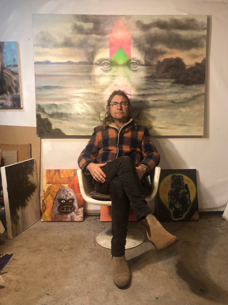 With painting I like to play with tension between planes by combining flat 2D elements like patterns and surface ornamentation (patterns from board shorts, domestic objects/furnishing fabrics, surfboard ‘sprays’…etc.) often achieved with airbrush and masking/stencilling techniques (as per surfboard design application) along with more traditional oil painting techniques.