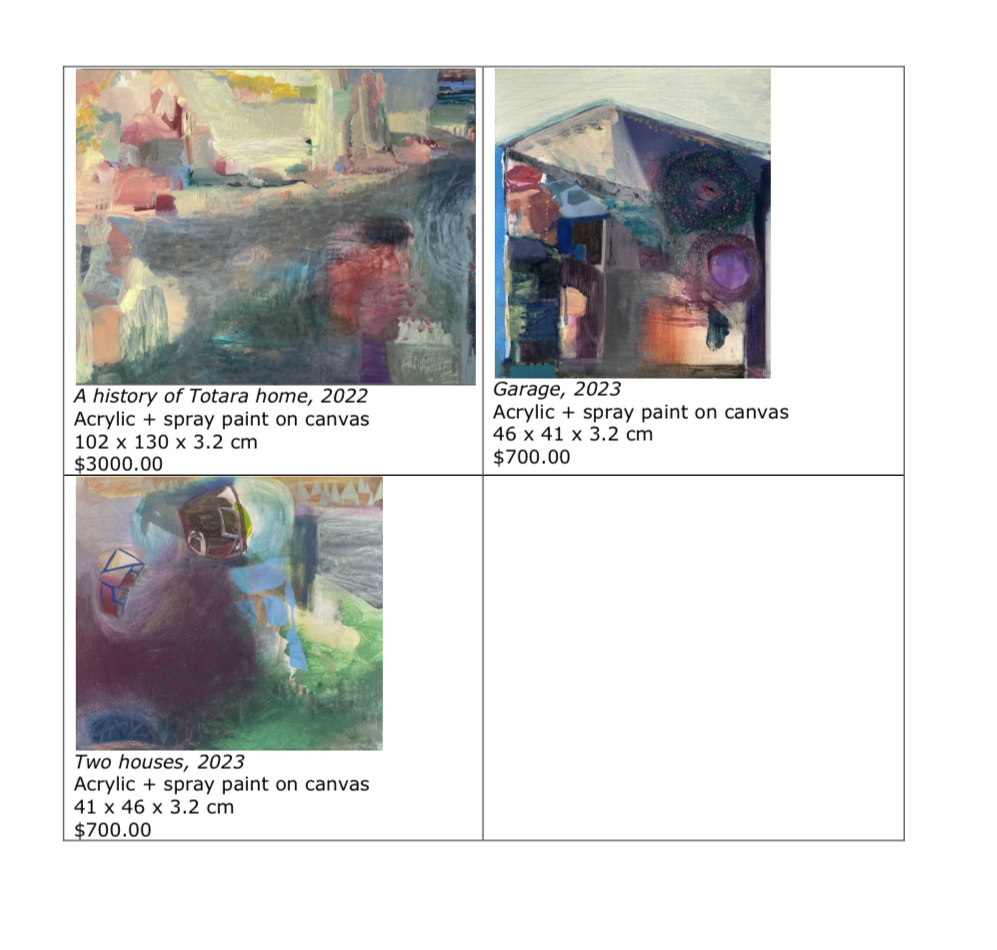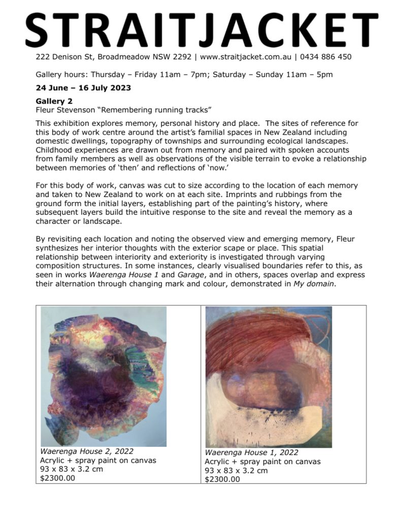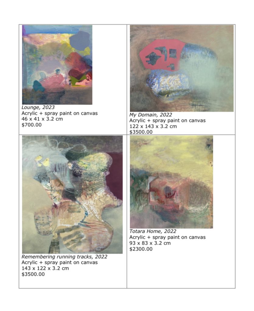 By revisiting each location and noting the observed view and emerging memory, Fleur synthesizes her interior thoughts with the exterior scape or place. This spatial relationship between interiority and exteriority is investigated through varying composition structures. In some instances, clearly visualised boundaries refer to this, as seen in works Waerenga House 1 and Garage, and in others, spaces overlap and express their alternation through changing mark and colour, demonstrated in My domain.