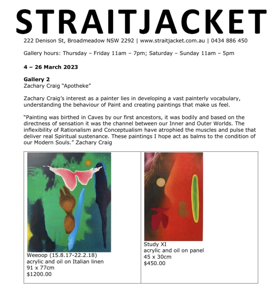 “Painting was birthed in Caves by our first ancestors, it was bodily and based on the directness of sensation it was the channel between our Inner and Outer Worlds. The inflexibility of Rationalism and Conceptualism have atrophied the muscles and pulse that deliver real Spiritual sustenance. These paintings I hope act as balms to the condition of our Modern Souls.” Zachary Craig
