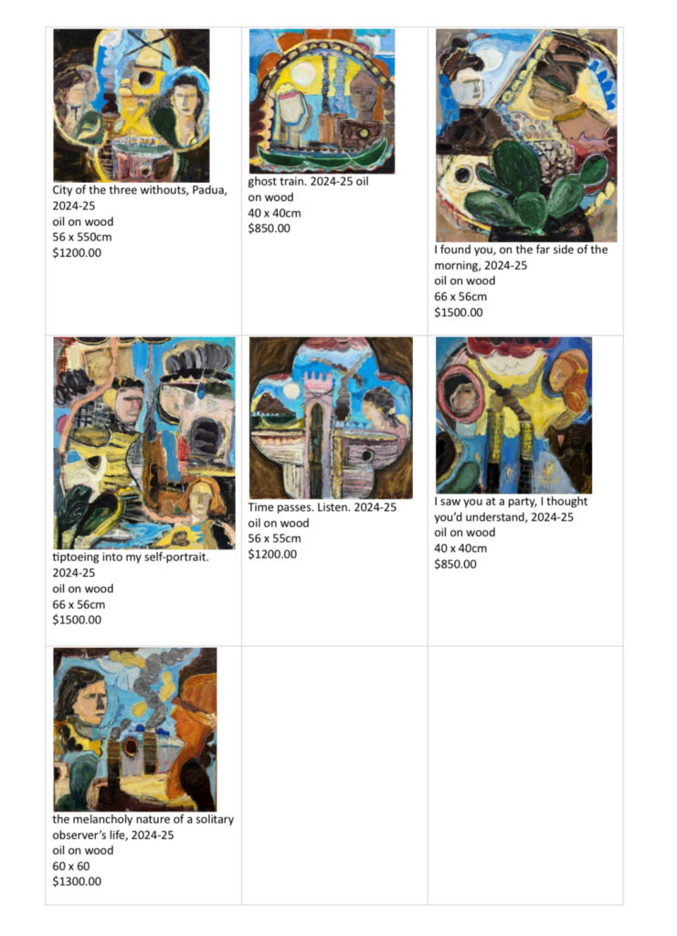 Michelle wrote that in these paintings she is, “just drawing loose connections from travel experiences”. Hang on, loose connections? Not only are these antiquities, ruins, busts, statues, decorative elements, patinations, portholes, faces, chimneys, boats, smoke, water and dry stone walls not random, they are connected by the tightest bond – that of deep personal meaning. Look how many times she repeats them. These non-loose, urgent, important images migrated en masse into the underground chambers of her soul, and it is from this library of forms that the artist creates her compelling, unapologetic, vivid paintings.