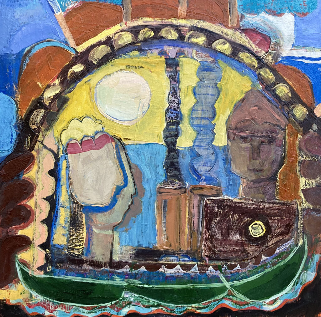 ‘My paintings contain self-portraits and other figures gazing through real and imaginary portholes. Themes of distance and desire, symbolized by the moon and the sea, recur. However the paint itself is also my subject. For me, no work is complete until I feel the paint itself is in position. To do this I use a blade to cut it back along its edges, not unlike cutting shapes for collage. It is only then that I feel the surface can support the emotional cargo of each painting’s narrative’.